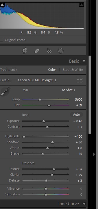 Even with the 830 nm filter, the sensor still receives some visible light and it comes into Lightroom with a strong reddish cast. I solved this by creating an import filter that automatically converts the image to Adobe Monochrome color profile.