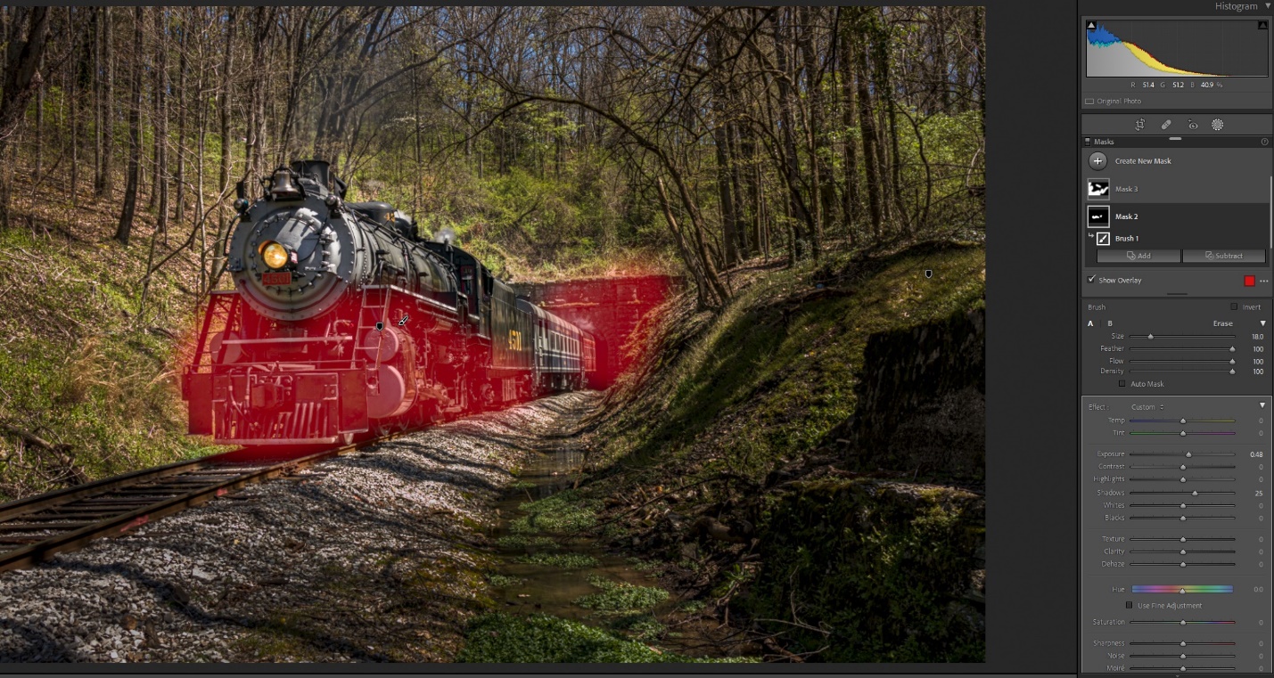 Next I used a brush to lighten the train’s undercarriage, the front of the engine and the tunnel wall. I increased exposure by about ½ stop and increased the shadows by about 25%. You can see the areas I painted highlighted in red.