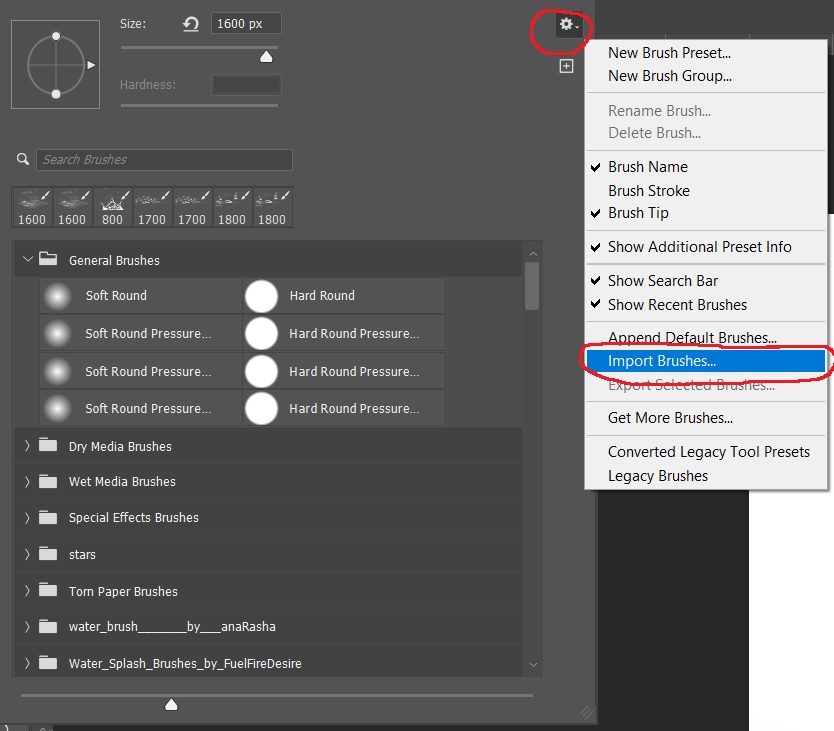 The second method if Photoshop is already open is to click the drop down arrow next to the brush size on the toolbar to open the brushes menu. Click on the gear icon to bring up the settings menu and go down to import brushes, then browse to the folder where your brush set is stored.
