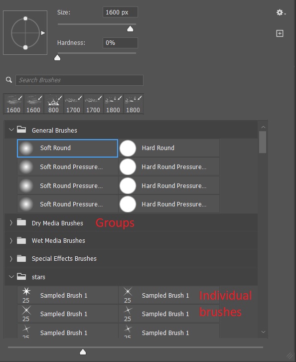 Clicking on the arrow by a group opens the folder to show the individual brushes.