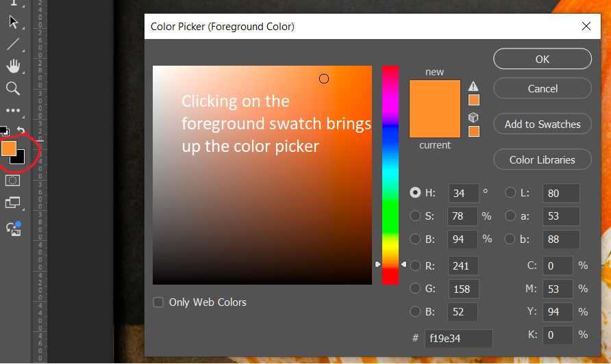 A handy trick for picking a color that is already in your image is with the brush tool selected, press the “alt” (option on a Mac) and click on a color in your image and it will set that color as the foreground.